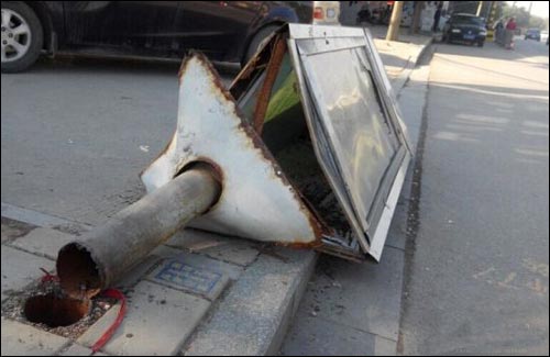 底座锈蚀严重 大风将蒿里山站牌吹倒