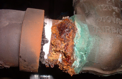 不同金属相连接时,可发生电偶腐蚀,这种腐蚀现象的发生很大程度上依赖于现有的腐蚀条件和管道系统。同冷冻水或消防系统相比,这种腐蚀现象在开放冷凝水和工艺用水系统中更为常见。例如,电偶腐蚀常常会发生在碳钢管和黄铜阀相连的位置,发生在镀锌钢和黄铜阀相连接的位置时最为严重。蓝绿色沉淀物沉积在阀门处,而钢管和钢管相连的位置并没有泄漏,证明了电偶腐蚀条件的存在。这样的现象在实际生产和生活中极为常见。但这种现象出现时腐蚀损害已经很严重了,可能导致大范围失效和整个管道的分离。