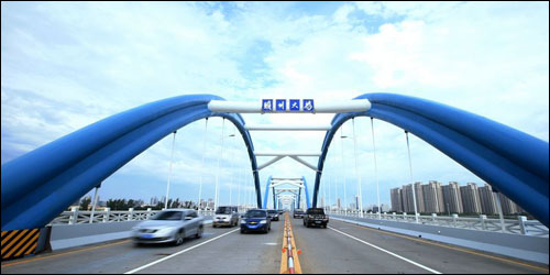 琼州大桥于2000 年12 月开工, 2003 年5 月建成通车。它是跨越南渡江上的一座特大型桥梁,全长1396.98m, 其中主桥长480m, 东引桥长452.74m,西引桥长464.24m。主桥为5 跨( 188m+98m+108m+98m+88m)下承式钢管混凝土系杆拱桥, 拱肋为钢管混凝土哑铃断面,下部结构为整体式钢筋混凝土薄壁空心墩,基础为钻孔灌注桩。引桥为连续箱梁和T 形梁。