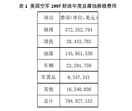 美空军1997财政年度的直接腐蚀维护费用估计大约为8亿美元,表1为该总费用的构成要素。
