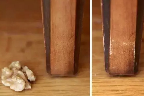 用核桃肉去摩擦刮花的原木家具表面,然后用手指按压划痕处,帮助核桃的油分渗透。几分钟后用软布擦拭,划痕就会变浅甚至消失。