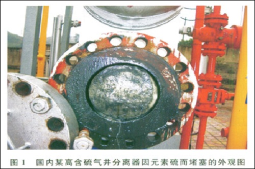 高含硫天然气中硫含量超过一定温度、压力条件下的溶解度会导致气井中发生硫沉积。沉积的元素硫或以固态颗粒的形式附着在管道或阀门等部位内部,或与管道内的析出水混合形成硫悬浮溶液,或在较高温度和压力环境中以液态硫形式存在,液态硫随环境温度和压力的降低又重新结晶形成固态硫覆盖在管道内壁。当元素硫大量沉积时,会堵塞流体通道,导致关井停产。图1展示了国内某高含硫气井分离器由于元素硫和天然气水合物的沉积而导致分离器完全堵塞的外观。