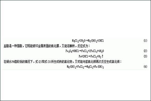 当这些高含量的氯化镁盐类的水进入锅炉后,在锅内高温(180℃以上)时,容易发生水解反应而生成酸。