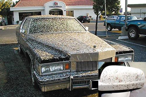 鸟粪和昆虫尸体中含有酸性物质,长时间停留在车上,会对车身漆面有产生腐蚀,这是每一个爱车的车主最不能容忍的,因此,见到它们,应迅速将之除去,但是,千万不可用硬物硬抠。如果没来得及马上去除,但是鸟飞或昆虫尸体又没有完全硬化,可将稀释过的汽车清洁剂倒在上面,然后用纸巾或毛巾覆盖在上面,即可除去。如果车停的太久没发现,鸟粪已经硬化,小i建议可以拿一块毛巾蘸点汽油,覆盖于鸟粪表面,再顽固的污物都能立刻去无踪。