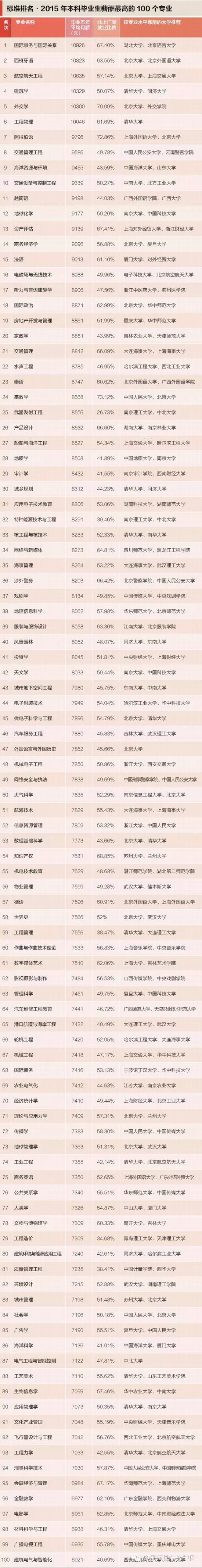 女怕嫁错郎,男怕选错行。读什么专业,毕业后能拿到高薪?小编从iPIN.com(专业求职网站)所公开的国内高校506个本科专业的就业数据,制作了《2015本科专业毕业生薪酬排行榜》,找出了本科毕业生薪水最高的100个专业,供大家参考。
