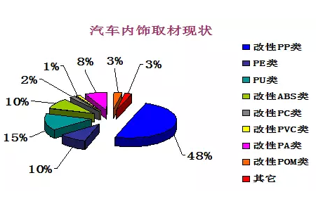 汽车内饰件包括仪表板、车门内板、方向盘、座椅、顶篷、地垫、遮阳板、储物盒、烟灰缸等,另外还有一些附属设备如音响、空调、通信、电视、照明灯具等;汽车外装件,包括保险杠、散热器格栅、侧防撞条、后导流板、各种车用灯具、车用玻璃,以及车门把手、雨刮、门锁等车身附件。这些内外饰部件的功能、形状和结构各异,将它们有机地组合在一起,形成一个统一、协调、美观的内外饰系统。其中的很多部品使用的材料均为塑料类材料,目前世界上不少轿车的塑料用量已经超过120千克/辆,个别车型还要高,德国奔驰高级轿车的塑料使用量已经达到150千克/辆。国内一些轿车的塑料用量也已经达到90千克/辆。图1表示汽车内饰件材料应用的现状。