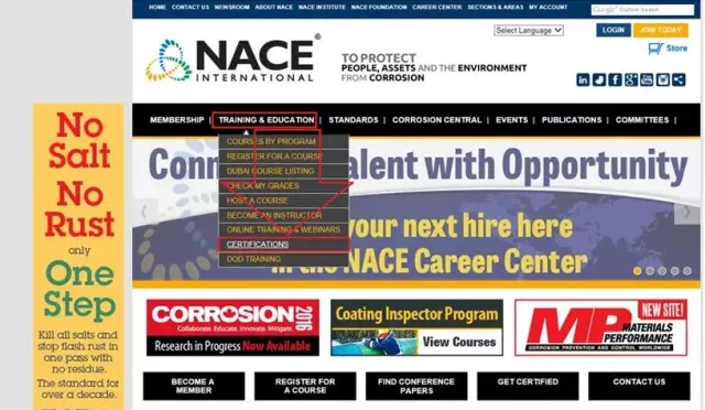 1.打开NACE国际的网页http://www.nace.org;找到“Training & Education”,点击“CERTIFICATIONS”。