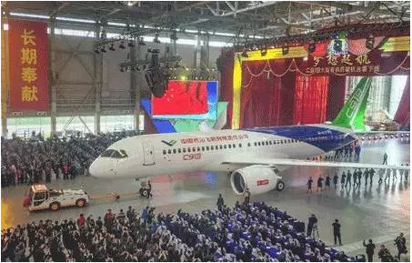11月2日,在中国商飞公司新建成的总装制造中心浦东基地厂房内,随着两扇帷幕缓缓拉开,一架带有“商飞蓝”和“商飞绿”全新涂装的新型商用飞机完整地展现在众人面前,这就是我国自主研制的C919大型客机。