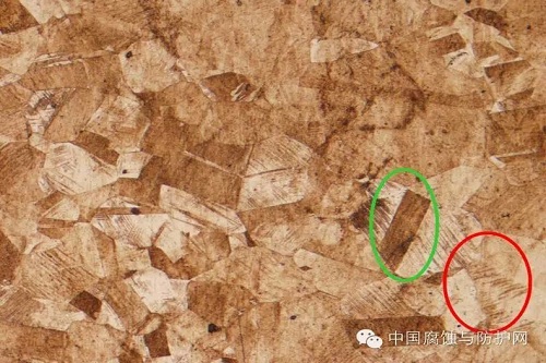 纯金属及单相合金的腐蚀是一个化学溶解的过程。由于晶界上原子排列不规则,具有较高自由能,所以晶界易受腐蚀而呈凹沟,使组织显示出来,在显微镜下可以看到多边形的晶粒。若腐蚀较深,则由于各晶粒位向不同,不同的晶面溶解速率不同,腐蚀后的显微平面与原磨面的角度不同,在垂直光线照射下,反射进入物镜的光线不同,可看到明暗不同的晶粒。