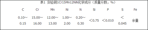 实验钢采用某公司生产的1Cr15Mn12NiN奥氏体不锈钢,其具体化学成分如表1所示。