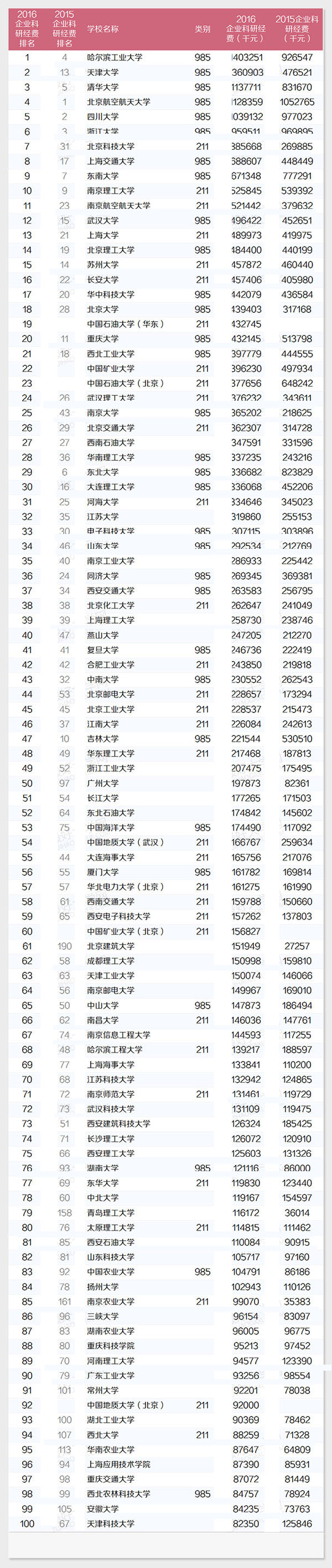 哈尔滨工业大学从企业获得14.03亿元科研经费,一举夺得2016高校企业科研经费桂冠。天津大学今年表现突出,由去年的第13名跃居今年的第2名,企业科研经费13.61亿元是去年的3倍。清华大学由去年的第5名升至今年的第3名。今年榜单4至6名依次是北京航空航天大学、四川大学、浙江大学。进入排名前十的高校同时还有北京科技大学(第7名)、上海交通大学(第8名)、东南大学(第9名)、南京理工大学(第10名)。