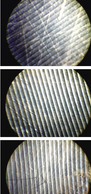 从上到下依次为显微镜下,浸泡在狗尿中的轮圈、浸泡在雨水中的轮圈、没有浸泡的参考样本三者的腐蚀程度