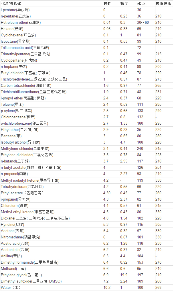 有机溶剂的极性根据官能团和对称性可初步判断,具体的需参照极性参数,如下: