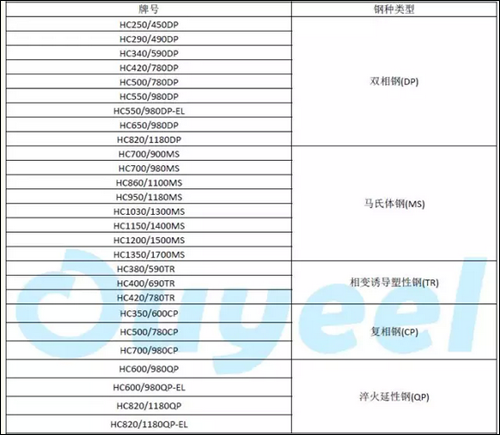 部分汽车用高强钢典型牌号