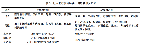 2)缓蚀防锈剂。脱水防锈剂具有极强的渗透能力和水置换能力,喷涂或刷涂在飞机金属结构上,可自动去除表面及缝隙中水分和盐分,并很快形成一层透明的硬膜,对飞机上钢、铜、铝、镁、镉、锌等多种金属均有良好防护作用。脱水防锈剂的种类、用途及相关产品见表3。