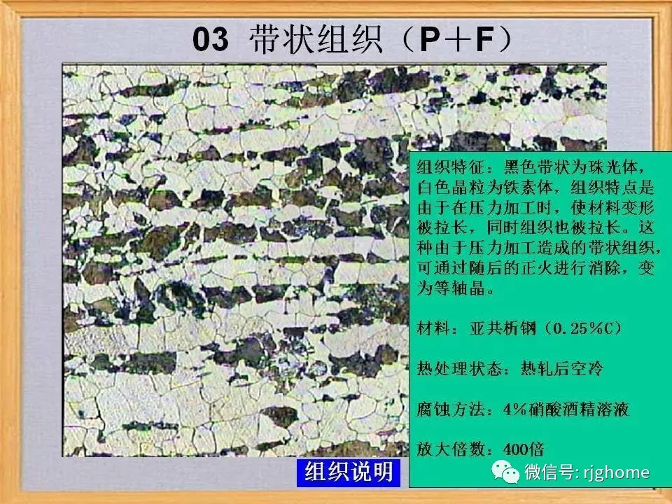 一、带状组织(banded structure)是钢材内部缺陷之一,出现在热轧低碳结构钢显微组织中,沿轧制方向平行排列、成层状分布、形同条带的铁素体晶粒与珠光体晶粒。这是由于钢材在热轧后的冷却过程中发生相变时铁素体优先在由枝晶偏析和非金属夹杂延伸而成的条带中形成,导致铁素体形成条带,铁素体条带之间为珠光体,两者相间成层分布。