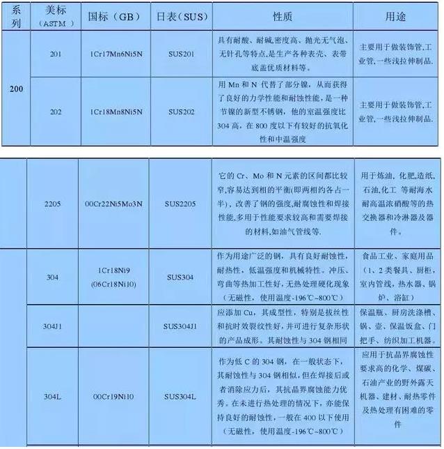 1、304不锈钢。是应用量较大、使用范围最广的奥氏体不锈钢之一,适用于制造深冲成型部件和输酸管道、容器、结构件、各类仪表本体等,也可以制造无磁、低温设备和部件。