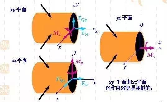 在一定条件下,杆件所有内力分量作用的效果,可以视为各个内力分量单独作用效果的叠加。通常可归结为三组平面内内力分量与外力: