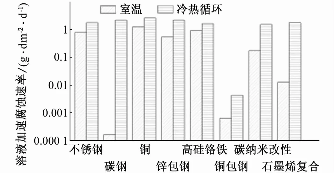 图1 在室温和冷热循环条件下酸性溶液中不同接地材料的溶液加速腐蚀速率