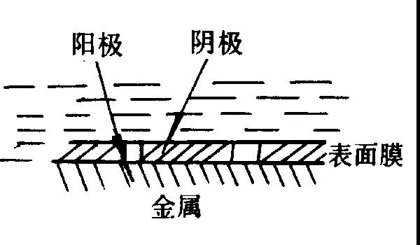 ④ 金属表面膜不完整构成微观电池。金属表面形成的钝化膜或镀覆的涂层存在孔隙或发生破损,裸露出金属基体,金属基体电位较负,钝化膜或覆层的电位较正,金属基体与钝化膜或阴极性涂层构成微观腐蚀电池,孔隙或破损处作为阳极而受到腐蚀,图2-9。
