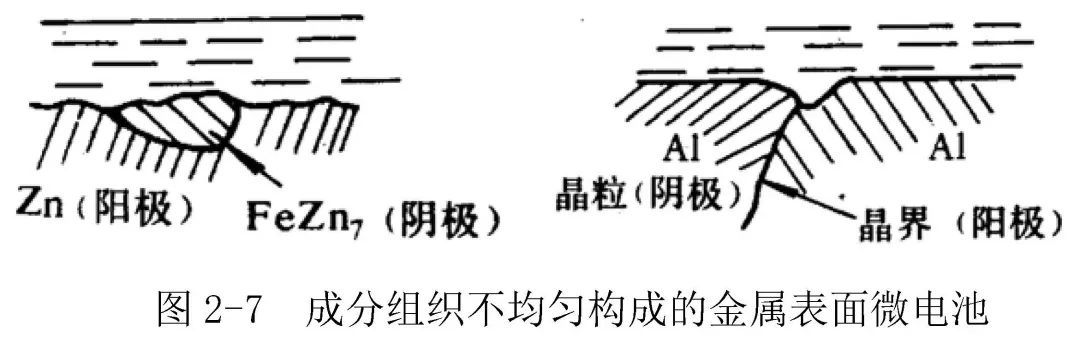 ② 成分和组织不均匀引起的微电池;如:碳钢中的渗碳体Fe3C,工业纯锌中的铁杂质FeZn7,铸铁中的石墨等,晶粒-晶界腐蚀微电池,图2-7。
