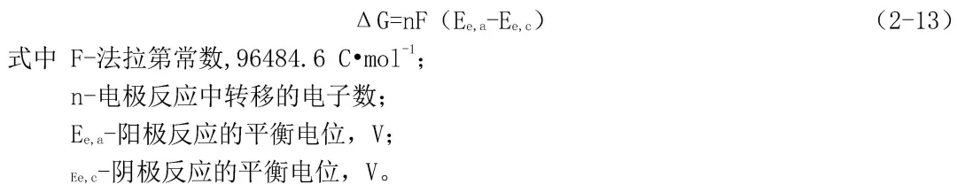 一个腐蚀反应是否会发生,同任何其他过程一样,取决于这个反应进行时整个体系的自由能是否降低。如从反应体系的始态转变为反应体系的终态,自由能降低,则这个反应就能够自发地进行。对于一个电化学腐蚀反应来说,自由能变化ΔG可以用式(2-13)表示: