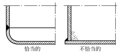 压力容器结构设计应服从防腐蚀要求,如,容器排污或出口设计不当,会在一些低凹处发生液体聚集现象,从而发生腐蚀。容器的器壁与底部的连接形式必须考虑,以免产生沉淀积聚物的死角,在某一部分有沉积物积聚时,须便于不断清除沉积物,如图3-27所示。直角就较圆角易于积聚,且不易清除沉积物。在设计大型压力容器时,在其最低点应有液体排放口,这样在排放设备中的液体时就不会有残余,同时也便于清洗设备。对管路和转动部件的设计应考虑有最高的放气口,以防止气蚀的产生。