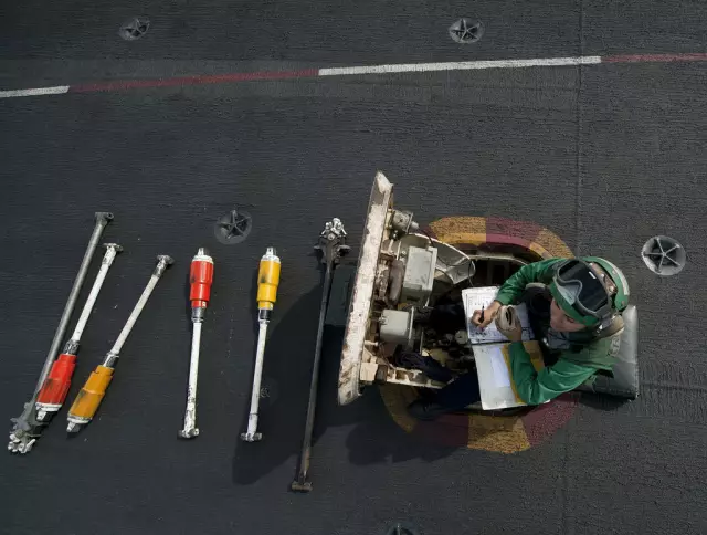 现代航母通常采用全金属飞行甲板,表面有一层坚固的飞行甲板涂料,主要用途是提高摩擦力。