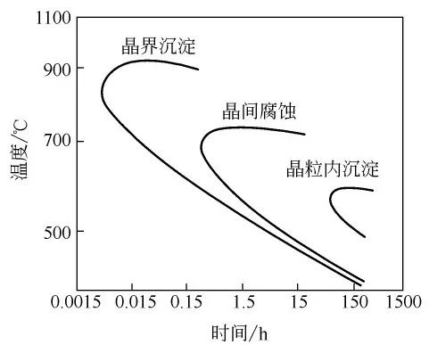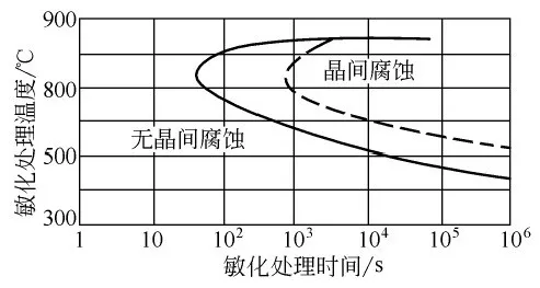 表明产生晶间腐蚀倾向的加热温度与时间条件的曲线叫做晶间腐蚀TTS曲线。奥氏体不锈钢析出碳化物的加热温度与时间的关系,以及产生晶间腐蚀倾向的加热温度与时间的关系都呈“C”形曲线关系,能产生晶间腐蚀倾向的温度称为敏化温度。奥氏体不锈钢的敏化温度范围在500~850℃之间,一般以650~700℃为最敏感。在敏化温度范围,随加热时间增加,奥氏体不锈钢的晶间腐蚀倾向增大,达到最大值后晶间腐蚀倾向反趋减小,直到消除晶间腐蚀倾向。这是因为加热时间过长,Cr逐渐扩散到晶界区,消除了贫Cr的缘故。