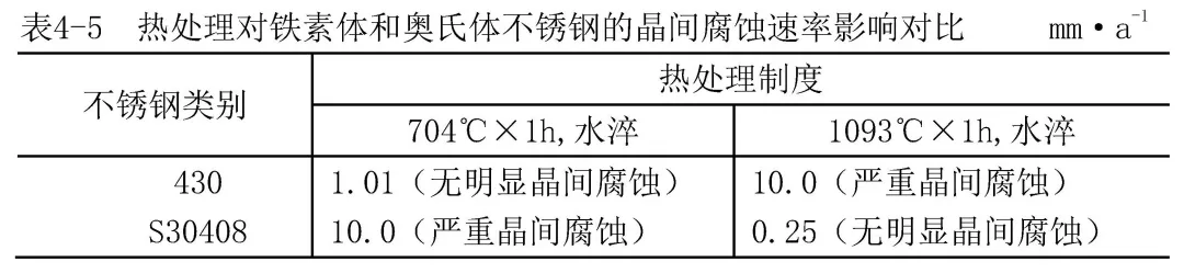 常见的0Cr13、Cr17、Cr25、Cr28 等4种铁素体不锈钢,对铁素体不锈钢要求在高、低温时均无γ相而仅有α相。不含Ti、Nb等稳定化合金元素的铁素体不锈钢与奥氏体不锈钢一样,焊后也可以发生晶间腐蚀。与奥氏体不锈钢相似,铁素体不锈钢的晶间腐蚀也具有TTS曲线。在高纯的铁素体不锈钢中加入Mo,可使TTS曲线右移。但在强氧化性介质(例如沸腾的65%(mass)HN03)中,高Mo并没有优点,钛也不能抑制晶间腐蚀。Cr质量分数在16%~28%范围内,对晶间腐蚀趋势没有影响,但导致其具有晶间腐蚀倾向的敏化处理以及抑制或消除其晶间腐蚀倾向的处理条件正好与奥氏体不锈钢的相反。奥氏体不锈钢的固溶处理温度恰好是使430(Cr17)铁素体不锈钢产生晶间腐蚀倾向最敏感的温度,而使S30408钢产生晶间腐蚀倾向的敏化温度却是消除430钢晶间腐蚀倾向的解消处理温度,表4-5。