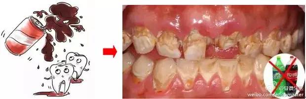 图2是一个5岁宝宝的牙齿[1],已经成了“可乐牙”。该宝宝从3岁开始喝可乐,而且自从喝上可乐后,再也不肯喝水,他每天要喝3瓶可乐,二年后牙齿成了图2的模样。碳酸饮料中含有大量的酸性物质,对牙齿表面的珐琅质具有溶解作用,另外饮料中还含有大量的糖分,造成口腔中细菌的繁殖和发酵,进一步产生对牙齿有害的酸性物质。