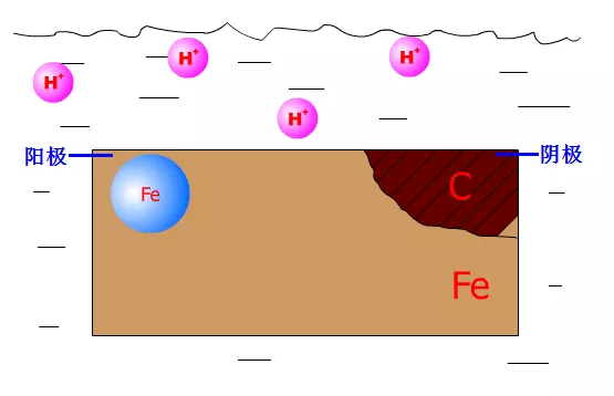 金属的腐蚀在多数情况下是属于电化学腐蚀,这种腐蚀发生时,环境介质中一定存在着一种或几种可以将金属氧化的物质,最常见的这种氧化性物质是氢离子(H+,酸性介质中大量存在)和氧气分子(O2,空气中和与空气接触的水中普遍存在)。电化学腐蚀发生时,在金属表面会形成一个腐蚀原电池。如碳钢在酸性介质中,铁表面由于同时有铁和碳,铁电位低于碳电位,成为腐蚀原电池的阳极,而碳电位较高成为阴极(图1)。在阳极区和阴极区,分别发生以下反应: