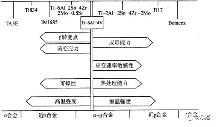 一般将钛合金划分为α型、α+β型、β型钛合金。根据钛合金从β相区淬火后的相组成与β稳定元素含量关系的示意图,如图1所示。钛合金划分为以下六种类型,各类钛合金的主要特征如图2所示。