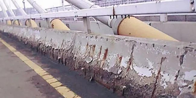 对桥梁来说,融雪剂可是强腐蚀剂,它能够渗透到桥梁水泥内部腐蚀其钢筋骨架,由于盐水向下逐层渗入,导致一些梁头及帽梁混凝土出现裂缝、剥落, 钢筋外露、锈蚀等。此外,洒盐水还会使部分桥梁线缆受到损坏。