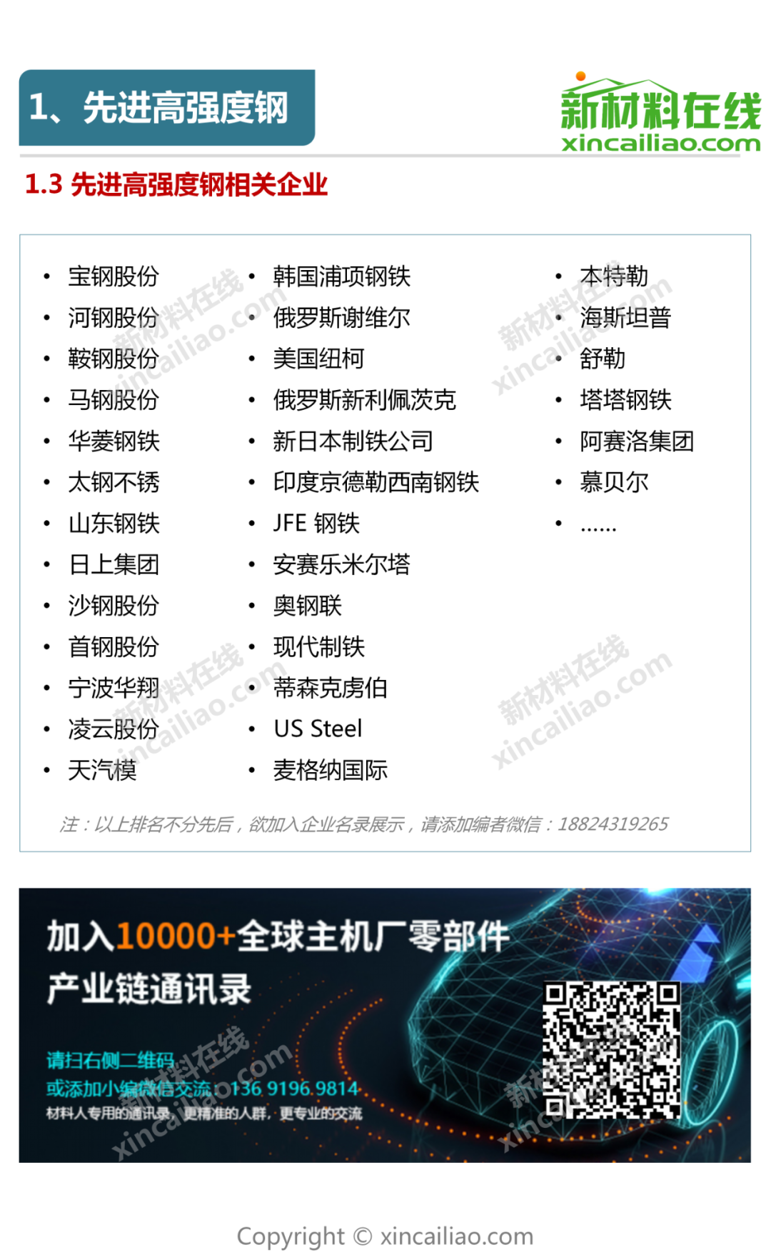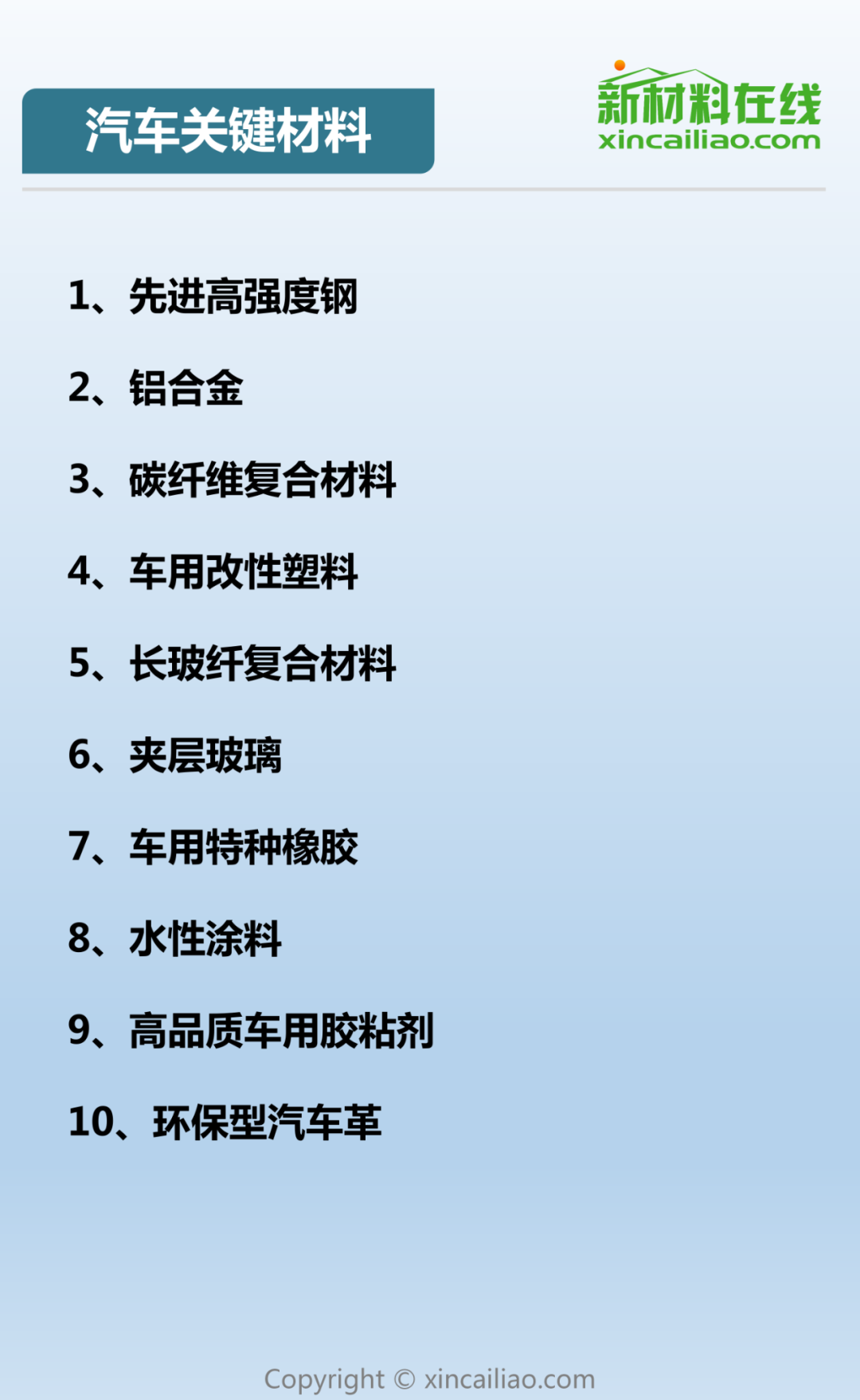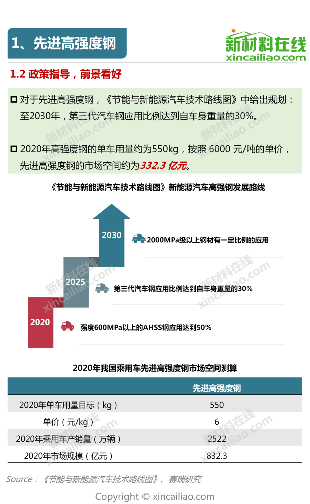 根据我国工信部、发改委、科技部三部委联合印发的《汽车产业中长期发展规划》中的指导,新能源、智能化、轻量化已成为未来汽车产业的发展方向,而先进车用材料则成为其中的重要内容,成为人们关注的热点。