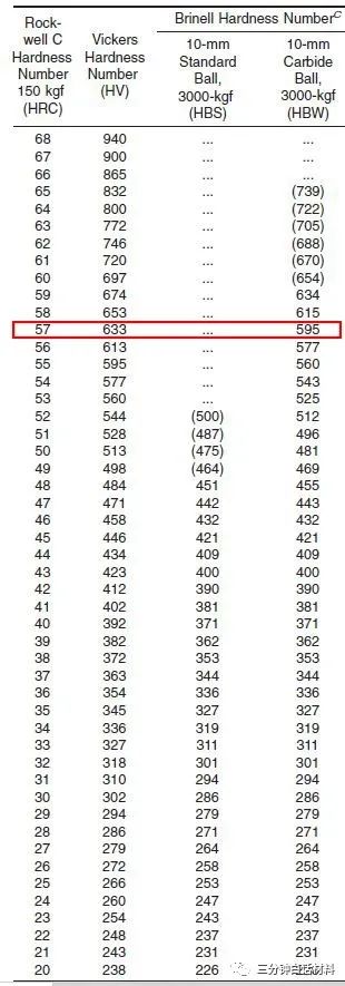 3)在一定条件下,HB与HRC可以查表互换。其心算公式可大概记为:1HRC≈1/10HB。《ASTM E 140 金属标准硬度换算表》