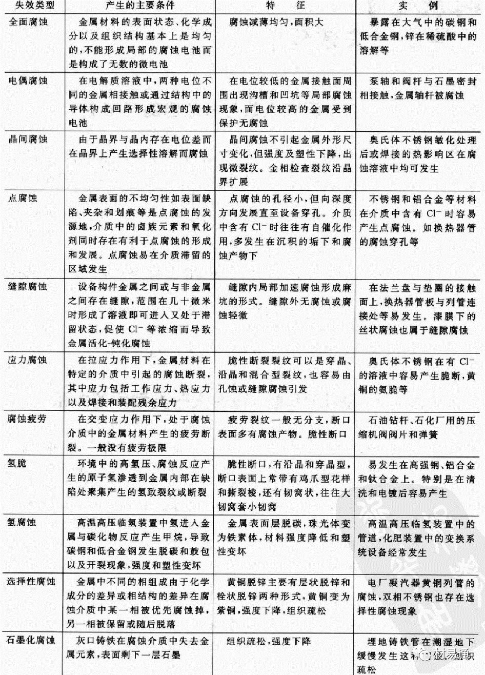 工程中常见的金属腐蚀失效破坏类型的特征及产生的条件