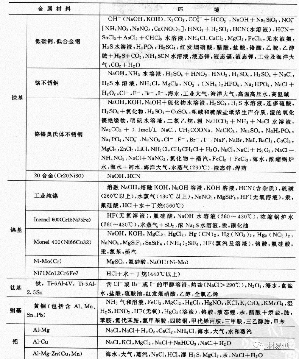 易产生应力腐蚀破裂的金属材料与环境的组合