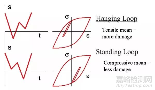 周期顺序的排序也会影响疲劳寿命。以图7所示的两个时间关系图为例。二者看似是由两个范围相同、平均应力也相同的周期组成,但是如果我们绘制弹塑性响应图,会发现在较小周期下第一个例子发生的是平均张力,第二个例子是平均抗压。因此,第一个例子造成的损坏会比第二个大。对大多数实际分析来说,顺序效应并不显著,因为一种顺序发生的概率与另一种的概率是相等的。但是在规划某些简化和理想化的载荷顺序时,这点值得注意。