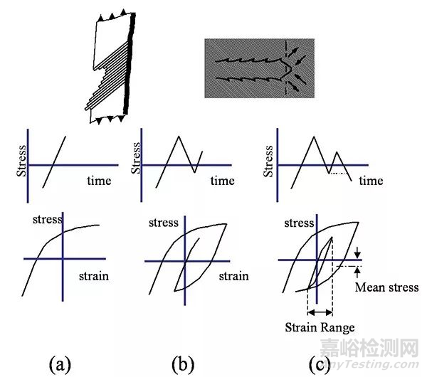 通过前面的介绍我们注意到在阶段一和阶段二的扩展过程中,裂纹在微观尺度都是塑性剪切应变引起的。因此,把沿阶段一滑动面或在阶段二裂纹尖端形成的塑性剪切应变考虑作为名义应力随时间推移产生的结果,如图6所示。在图6a中,我们观察到名义应力随时间增大。在微观层面,由于裂纹或原本存在缺陷的原因,应力和应变呈塑性,并可被绘制成所示的应力—应变关系图;图6b所示的是名义应力先降低然后小幅增大时发生的状况。此时仍可绘制出局部应力与应变的关系图,显示了局部断裂的影响;图c是另一种名义应力降低的情况。从应力与应变关系图我们看到有滞后回线形成,应力与应变关系图中的回线显示了总的释放能量与回线的面积相等时所释放的应变能量。本质上释放的是一定数量的剪切应变能,在滑动面滑动或阶段二裂纹扩展时消耗了该能量。
