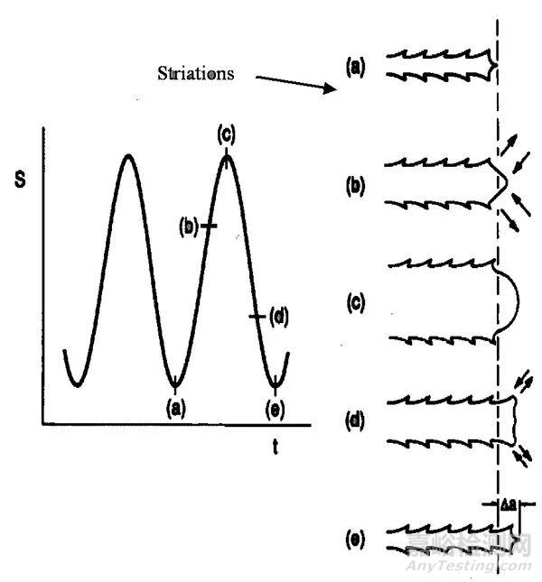 为理解阶段二的扩展机制,我们需要考虑在应力周期过程中裂纹尖端横截面发生的状况。如图5所示。当名义应力处于“a”点时疲劳周期开始。随着应力强度增大并穿过“b”点,我们注意到裂纹尖端张开,导致局部塑性剪切变形,同时裂纹延伸到原金属中的“c”点。当拉伸应力经过“d”点下降,我们观察到裂纹尖端闭合,但永久塑性变形留下了一个独特的锯齿形,即所谓的“切面纹”。当整个周期在“e”点结束时,我们观察到裂纹现在已经增加了“Da”长度,并构成额外的切面纹。现在可以理解裂纹扩展的范围与施加的弹塑性裂纹尖端应变范围成比例。更大的周期范围能形成更大的Da。