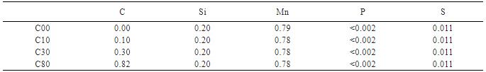 表1为试验材料的化学成分。这些是以一般机械结构用碳钢JIS-S30C为基础,使C含量变化为0、0.1、0.3及0.8%的成分系(以下称为C00、C10、C30、C80)。