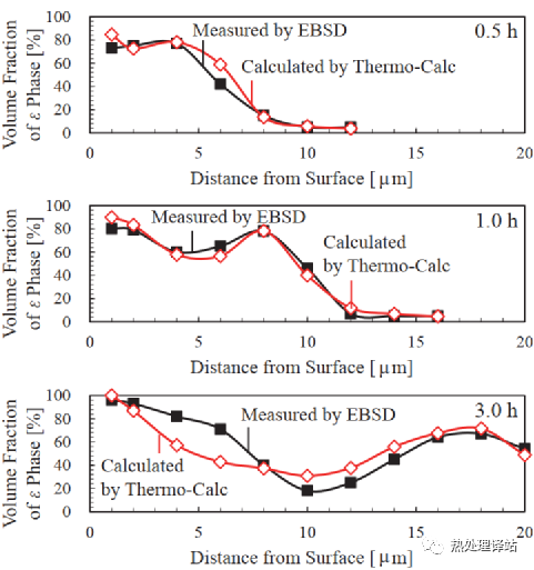图10 用EBSD法测定的渗氮0.5、1.0和3.0小时的0.8%C钢化合物层中ε相的体积分数分布,并根据N和C的分布,用Thermo- calc 2016b计算了ε相的体积分数分布