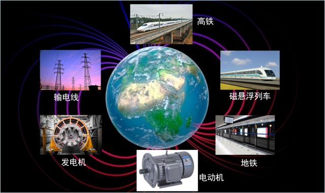 只要有电流产生,就有感应磁场存在。直流电诱导产生直流磁场,交流电诱导产生交变磁场。发电机就是利用“磁生电”原理,通过能量转换,将其他形式的能源转换为电能;电动机则与之相反,将电能转化为机械能。磁电相生是自然科学中的基本规律。在日常生活中,很多生活与工业装置周围都能产生磁场,发电机与电动机就是其中之一,甚至在人体内,伴随着生命活动,一些组织和器官内也会产生微弱的磁场[4]。随处可见的输电线路,可以将电能长距离传输,其中通过大电流的输电线周围会产生强磁场。在轨道交通中担任重要角色的地铁和高铁,产生的杂散电流会产生杂散磁场,新型交通工具磁悬浮列车更是磁场与运动设备紧密结合的典型范例,见图1。