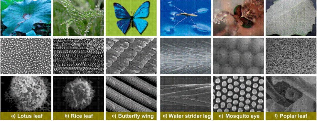 (a) 荷叶;(b) 水稻叶;(c) 蝴蝶翅膀;(d) 水黾腿;(e) 蚊子复眼;(f) 杨树叶