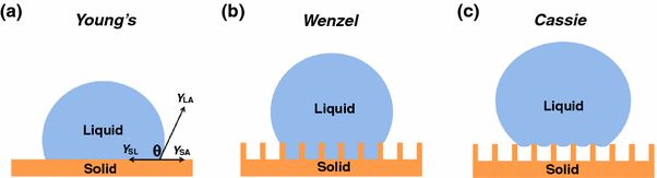 (a) Young’s模型;(b) Wenzel模型;(c) Cassie-Baxter模型