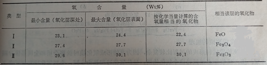 图1为铁-氧平衡图。氧与铁形成不同结构的氧化膜组成相,由平衡图上可看出依含氧量不同分别为FeO(FexO)、Fe3O4、Fe2O3。铁的氧化物相的含氧量见表1,它们在表面的分布见图2所示。