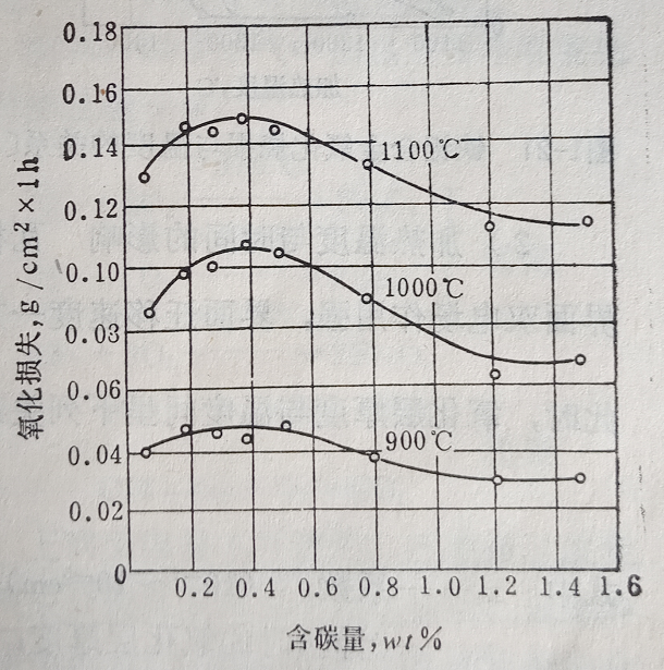 当含碳量小于0.04%时,氧化速度随含碳量增长而升高;当含碳量大于0.4%时,氧化速度却随含碳量增加而减小。显然是由于氧化介质与钢中的碳相互作用形成气体CO、CO2有关。