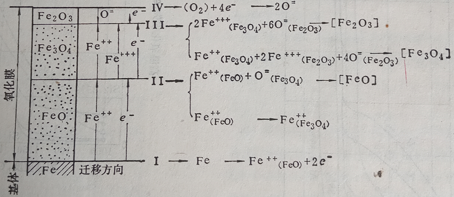 1)首先,在界面Ⅰ上的铁原子形成Fe2+与2e-,并向FeO层中扩散,同时使界面Ⅰ向铁的一侧内移。