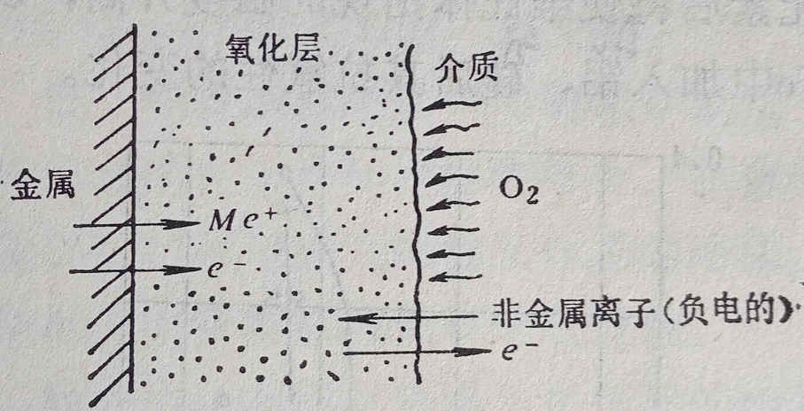 在图5中表示氧以负离子状态被吸附在氧化层表面上,而金属以正离子状态溶解在氧化膜中,所以氧化过程的推动力是浓度梯度(dc/dx)和氧化层中的电场。其中电场是由于在边界上的电子与离子运动速度不一样,从而形成双电荷层而产生的。